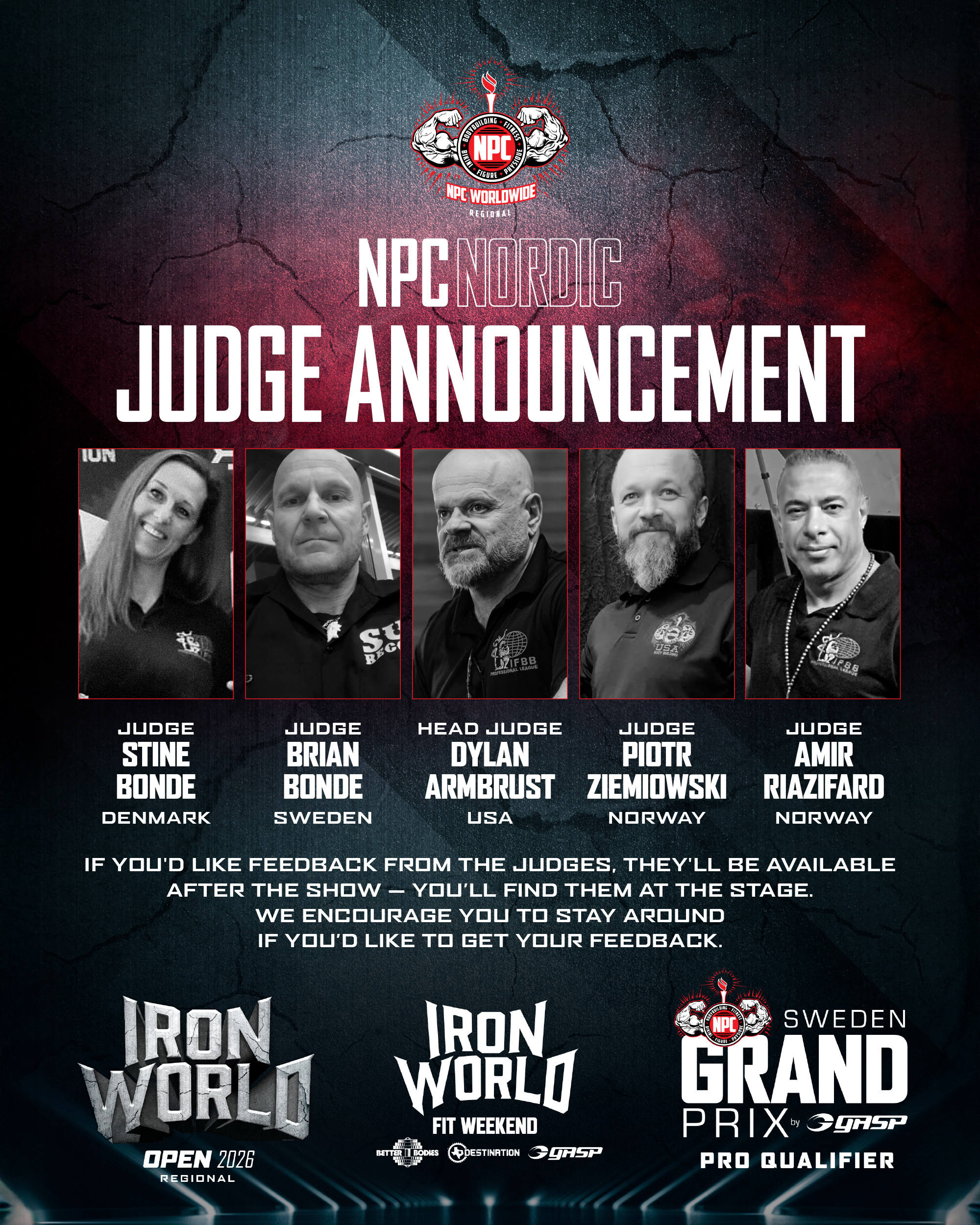 We are thrilled to present our incredible panel of NPC judges for this year’s Iron World Open & Sweden Grand Prix.